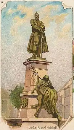 Unmittelbar nach dem Tod von Friedrich III. verabschiedete eine Bürgerversammlung in Elberfeld den Beschluss, dem „99-Tage-Kaiser“ ein Denkmal zu stiften. Das Komitee für das durch Spenden finanzierte Denkmal wurde von dem Reichstagsabgeordneten Reinhart Schmidt geleitet. Nach einem beschränkten Wettbewerb fiel die Entscheidung auf den Entwurf des Bildhauers Gustav Eberlein. Die Bronzefigur wurde am 18. Oktober 1893 eingeweiht, am gleichen Tag wie auch das Kaiser-Wilhelm-Denkmal auf dem Brausenwerther Platz am Döppersberg, das ebenfalls von Eberlein gefertigt worden war.