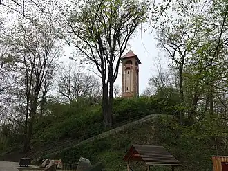 Im Jahr 1878 errichtete die Gemeinde auf dem erhöhten Areal einen hölzernen Aussichtsturm, der auch einen Zugang zum nahen „Restaurant zum Schloßberg“ hatte. Er wurde 1907 zu Ehren des Deutschen Kaisers Friedrich III. durch einen 26 Meter hohen Turm aus Mauersteinen ersetzt. Die Eingangshalle zierte eine Statue des Kaisers aus Eichenholz, ein Werk des Oberammergauer Holzschnitzers Andreas Lang.