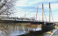Die beiden über der Fahrbahn 55 Meter hohen Pylone bestehen unten aus zwei in Brückenlängsrichtung aufgelösten Pylonstielen aus Stahlbeton und oben aus dem Pylonkopf. Der Pylonkopf hat beiderseitige Betonflanken und innere Stahlhohlkästen zur Verankerung von sieben Schrägseilen, bestehend aus Litzenbündeln, je Seite zur Abtragung der Lasten.[11]