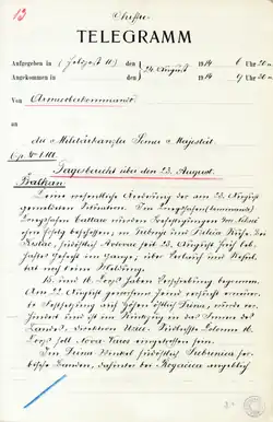Neben der Militärkanzlei Seiner Majestät wurden mit den Berichten auch der Landesverteidigungsminister, der Außenminister und das Kommando der Südwestfront bedacht. Sie wurden jeweils vom stellvertretenden Chefs des Generalstabs, Franz Conrad von Hötzendorf gezeichnet.[1] Anfangs wurden die Kaiserberichte per Hand verfasst, in Folge wurden Typoskripte erstellt, die aus den eigentlichen, verschlüsselten Telegrammen dechiffriert wurden. Mit der Thronfolge von Kaiser Karl I. wurden die Berichte im Zuge der Modernisierung und Effizienzsteigerung als "Hughes-Telegramme" erstellt, eine in der k.u.k Armee gängige Fernschreibertechnik.[3]