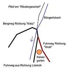 Lageskizze Kaisergarten Lösnich im Bereich einer Weggabelung im Gemeindewald. Beispielhaft für die Grundstücksform „Napoleonshut“.