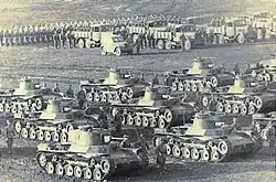 Die japanischen Panzer, deren Konstruktionen zumeist aus der Mitte der 1930er Jahre stammten, waren den westlichen Modellen, die man zu Beginn des Krieges antraf, unterlegen.[21] Die meisten leichten Panzer hatten ein Gewicht von annähernd 8 Tonnen, und boten Platz für eine dreiköpfige Besatzung. Zur Bewaffnung der leichten Panzer gehörte eine 37-mm 47-mm oder 57-mm Kanone als Hauptbewaffnung sowie ein 7,7-mm Maschinengewehr.[22] Die allgemeinen Merkmale der japanischen mittleren Panzer waren ein Gewicht von 15 Tonnen, eine Länge von 5,50 m, eine Breite von 2,20 m und eine Höhe von fast 2,40 m. Sie hatten eine Besatzung von vier Mann und waren unterschiedlich stark gepanzert. An der Vorderseite und den Seiten des Rumpfes war die Panzerung bis zu 26 mm dick, an der Unterseite jedoch selten mehr als 9 mm. Frühe Modelle hatten eine 57-mm-Kanone, die bei späteren Modellen durch eine 47-mm-Kanone ersetzt wurde, und führten zwei 7,7-mm-Maschinengewehre als Sekundärbewaffnung mit. Sie konnten 120 Schuss 47-mm-Munition und bis zu 4.000 Schuss 7,7-mm-Maschinengewehrmunition mitführen. Die Geschwindigkeit der späteren mittelschweren Panzer unterschied sich nicht wesentlich von der der früheren Versionen und betrug etwa 40 km/h.[23] Die Japaner hatten drei Modelle von Tanketten mit einem Gewicht von 3 bis 4,2 Tonnen. Die Höchstgeschwindigkeiten lagen zwischen 40 und 45 km/h. Sie trugen entweder eine 37-mm-Kanone mit einem 7,7-mm-Maschinengewehr als Sekundärbewaffnung oder hatten ein 6,5-mm-Maschinengewehr.[24]
