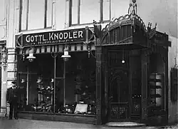 - Das Haus Kaiserstraße 26 an der Ecke zur Kasernengasse hatte früher die Adresse Kramstraße 44 getragen. Es war mehrfach umgebaut und umgestaltet worden. 1869 wurde eine Ladenfassade gestaltet, die Streit mit den Nachbarn hervorrief, später wurde die Fassade im Stil des Historismus umgestaltet und ein Café eingebaut, ehe 1907 der Hutmacher Gottlieb Knödler den Laden umbauen und eine Jugendstilfassade davorsetzen ließ.[48][49] Nach dem Zweiten Weltkrieg wurde das Huthaus Knödler von Friedrich Böhnle fortgeführt. Zu den weiteren Geschäften in der Kaiserstraße 26 zählten 1950 eine Verkaufsstelle der Bäckerei Welti, die Evangelische Buchhandlung von W. Schneider und die Geschäftsstelle der Victoria-Versicherung. 1952 eröffnete an dieser Adresse die Polstermaterialien-Großhandlung von Erich Gebhardt.[50] 1961 befanden sich in dem Gebäude Geschäftsräume des Bäckers Weltin, die Rock-Ecke Rathgeber und eine Generalvertretung der Allianz-Versicherung.