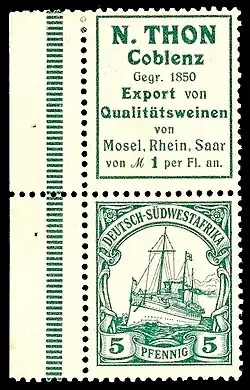 Beim Postamt Ponape auf den Karolinen wurde im Jahr 1905 die 10-Pfennig-Marke halbiert verwendet, nachdem ein Taifun einen Teil der Markenbestände zerstört hatte. Weiter erhielt dort im Jahr 1910 die 3-Pfennig-Marke den Handstempelaufdruck 5 Pf und es wurde die 10-Pfennig-Marke halbiert verwendet, jeweils unter Zusetzung des Dienstsiegels (sog. Ponape-Provisorien).[3] Auch in Kamerun kam es im Jahr 1911 zur Verwendung einer halbierten 20-Pfennig-Marke unter Zusetzen des Dienstsiegels (Longji-Provisorium).[4]