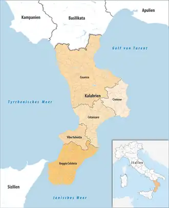 Karte Italiens, Kalabrien hervorgehobenAutonome Region SardinienAutonome Region SizilienKalabrienKampanienBasilikataMoliseApulienAbruzzenLatiumMarkenUmbrienToskanaLigurienAostatalPiemontLombardeiVenetienEmilia-RomagnaTrentino-SüdtirolFriaul-Julisch VenetienSan MarinoVatikanstadtAlgerienTunesienMaltaMontenegroBosnien und HerzegowinaKroatienSlowenienUngarnSchweizÖsterreichSchweizMonacoFrankreichFrankreichFrankreich
