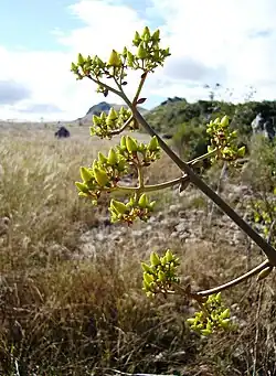 Der Blütenstand ist ein mehr oder weniger dichter ebensträußiger Thyrsus von 45 bis 100 Zentimeter Länge. Die aufrechten bis spreizenden Blüten sitzen an 5 bis 15 Millimeter langen Blütenstielen. Die fleischige Kelchröhre fehlt beinahe und endet in eiförmigen bis kreisrunden, zugespitzten bis etwas dornenspitzigen Zipfeln, die 3 bis 5 Millimeter lang und 1,4 bis 2,8 Millimeter breit sind. Die urnenförmige bis vierkantige Blütenkrone ist sehr fleischig, gelb, kahl oder lang behaart. Die 6 bis 15 Millimeter lange Kronröhre hat ausgebreitete, eiförmige-dreieckige, zugespitzt-dornenspitzige Zipfel von 2,5 bis 5 Millimeter Länge und 3 bis 6,5 Millimeter Breite. Die Staubblätter sind oberhalb der Mitte der Kronröhre angeheftet und ragen nicht aus der Kronröhre heraus. Die Staubbeutel sind eiförmig und 1,5 bis 2 Millimeter lang. Die trapezförmigen bis halbkreisförmigen Nektarschüppchen sind etwa 1,5 Millimeter groß. Das Fruchtblatt ist zwischen 6,5 und 10 Millimeter, der Griffel zwischen 2 und 2,5 Millimeter lang.