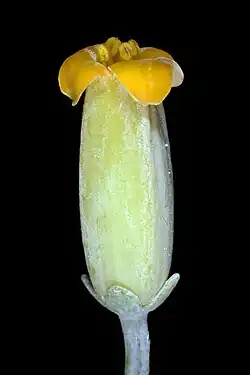 Die Blüten sind aufrecht und verströmen einen durchdringenden, süßlichen Duft. Die zwittrige Blüte ist radiärsymmetrisch mit doppelter Blütenhülle. Der 1 bis 1,5 Millimeter lange Kelch endet in eiförmigen bis lanzettlichen, zugespitzten Kelchzipfel. Die goldgelben, gelben oder graugrünen mit dickem Reif bedeckten Kronblätter sind zu einer nach oben vierkantigen, 12 bis 20 Millimeter langen Röhre verwachsen. Die Blütenkrone ist fast urnenförmig oder eiförmig-länglich. Die Kronzipfel sind bei einer Länge von 2 bis 5 Millimetern sowie einer Breite von 3 bis 4,5 Millimetern eiförmig, bis fast kreisrund. Die Staubblätter sind am oberen Ende der Kronröhre angeheftet. Die oberen Staubblätter ragen über die Röhre hinaus. Die Staubbeutel sind bei einer Länge von 2 bis 5 Millimetern von 1,5 bis 2 Millimetern eiförmig-kreisrund. Das Fruchtblatt ist 12 bis 15 Millimeter lang. Der Griffel hat eine Länge von 1,5 bis 3 Millimeter.