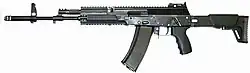AN-94 „Abakan“ (russisch автомат Никонова образца 1994 года „Абака́н“, deutsch Automat Nikonow Modell des 1994ten Jahres „Abakan“). Eigentlich keine Kalaschnikow im eigentlichen Sinne, da nur der grobe Aufbau und die Anordnung der Bedienelemente übernommen wurde. Beim AN-94 handelt es sich um das Ergebnis des „Abakan“-Projektes, das die Effektivität des einzelnen Soldaten erhöhen sollte. Dieses wurde mit dem AN-94 auf die Weise erreicht, dass sie über einen 2-Schuss-Feuerstoß verfügt, bei dem zwei Patronen schnell hintereinander abgefeuert werden. Auf diese Weise verlassen zwei Geschosse den Lauf, noch bevor der Rückstoßimpuls den Schützen erreichen kann. Um diesen „Hyperburst“ zu ermöglichen, musste vom AK-74M ausgehend einiges geändert werden. So wurde das AN-94 nicht nur erheblich verkompliziert, sondern nach Meinung der meisten Fachleute gehört es auch nur noch im weiteren Sinne zur Kalaschnikow-Familie. So wird neben der Patrone in der Patronenkammer immer eine weitere Patrone auf einem Ladelöffel bereitgehalten. Außerdem läuft der Lauf auf einer Schiene zurück. Die Waffe kann neben dem 2-Schuss-Feuerstoß auch in Einzelfeuer und Vollautomatik geschossen werden. Bei Vollautomatik werden die ersten beiden Schüsse immer im Hyperburst abgegeben. Danach regelt die Waffe aber die Feuergeschwindigkeit auf 600 Schuss pro Minute herunter. Die Granatgeräte GP-25 und GP-30 können montiert werden. Das AN-94 ist vom AK-74M vor allem durch die Schiene unter dem Lauf zu unterscheiden. Zudem ist die große Expansionskammer mit ihren zwei runden Kammern sehr auffällig.[34] Das AN-94 war zwar von 2012 bis 2013 offiziell neue Ordonnanzwaffe der russischen Streitkräfte, wurde aber nur in unbedeutender Stückzahl beschafft.[35] Aktuell ist sie nur in geringer Zahl bei Spezialeinheiten in Gebrauch.