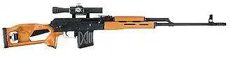 SW Dragunow Das SWD (russisch Сна́йперская Винто́вка Драгуно́ва, deutsch Scharfschützengewehr Dragunow) wird häufig fälschlicherweise mit zur Kalaschnikow-Familie gezählt, weil es einen ähnlichen Aufbau aufweist. Es übernimmt zwar den Wannenaufbau, verwendet aber ein anderes Gassystem. Das SWD arbeitet als Gasdrucklader über Kurzhub ähnlich wie das Selbstladegewehr SWT-40; die Verschlussfeder ist im Deckel befestigt und sitzt nicht brückenartig in einem Schuh in der Gehäusewanne.[33][29]