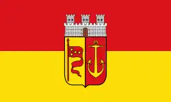 Blasonierung: „Gespalten in Gold (Gelb) und Rot; vorn ein an einer roten Stange flatternde rote Fahne darauf vier 6-zackige goldene (gelbe) Sterne im Verhältnis 2:1:1; hinten ein goldener (gelber) Anker. Im Oberwappen eine dreitürmige silberne (weiße) Mauerkrone mit braunem Tor.“[13] |