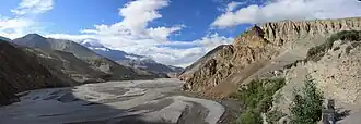 - Kagbeni (⊙), nördlich des Hauptkamms des Himalaya, 2850 m, an der Leeseite des Gebirges: Die örtliche Landwirtschaft (u. a. Getreide und Apfelbäume) ist abhängig von der Bewässerung aus dem Fluss, denn dort regnet es nur sehr selten (mittlere Niederschlagsmenge im Juli, dem regenreichsten Monat: 58 mm; Jahresmittel: 328 mm). Die Landschaft ähnelt einer Geröllwüste, bei sommerlichen Tageshöchsttemperaturen um die 20 °C.[3]