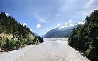 - Kalopani (⊙), 30 km weiter flussabwärts, ungefähr dort, wo das Flusstal den Hauptkamm durchquert, 2500 m über dem Meer: Auf den ersten Blick ähnelt die überwiegend aus Nadelgehölzen bestehende Vegetation der eines Tals in den Alpen. Typische Pflanzen sind dort aber auch Sanddorn, Hanf und Bambus. Die Tageshöchstwerte können im Sommer die 20 °C-Marke übersteigen. Im Juli, dem regenreichsten Monat, fallen im Schnitt 140 mm (Jahresmittel 659 mm, d. h., dort fällt im Schnitt doppelt so viel Regen wie in Kagbeni).[4]