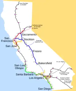 Kaliforniens öffentlicher Schienenpersonenverkehr ist traditionell unterentwickelt. Der Autoverkehr steht im Mittelpunkt und macht den Einzelnen zum „Sklave[n] des Autos“, wie es der Schriftsteller T. C. Boyle formulierte.[60] Die Ausnahme bilden die San Francisco Bay Area, mit einem nicht nur für Kalifornien, sondern in den ganzen Vereinigten Staaten führenden Regionalverkehrssystem, das auf dem Rückgrat des BART-Systems basiert, und die Hauptstadt Sacramento. Eine stetige Verbesserung des öffentlichen Nahverkehrs gibt es in Los Angeles, mit der seit 1990 in Betrieb genommenen Metro Los Angeles, die seitdem fast jährlich erweitert wurde und wird. Kalifornien ist über mehrere Strecken nach Osten und Norden an das Schienennetz der USA angebunden. Die Eisenbahn dient überwiegend dem Güterverkehr, die meisten Strecken gehören abgesehen von kürzeren Shortlines einer der beiden großen Bahngesellschaften Union Pacific Railroad (UP) und Burlington Northern Santa Fe (BNSF). Überregionale Personenzüge der Bahngesellschaft Amtrak fahren meist einmal täglich auf einigen Strecken von UP und BNSF, so etwa der Coast Starlight von Seattle nach Los Angeles. Ausnahmen bilden drei, etwa im Stundentakt bediente Strecken: