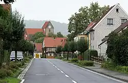 - Das Wahrzeichen des Dorfes ist die 1604 erbaute Wehrkirche im gotischen Stil, die auf einem Kalksteinfelsen den höchsten Platz des Dorfes einnimmt und aus einer alten Burganlage hervorgegangen ist.[7] Eine sechs bis sieben Meter hohe Mauer und der Wehrturm von 1495 sind noch erhalten.