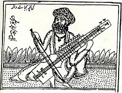 Das in der indischen Musik (von der Violine in Südindien abgesehen) am weitesten verbreitete Streichinstrument, die sarangi, lässt sich zwar nach der Bauform aus altindischen Vorläufern herleiten, die erste Beschreibung als Streichinstrument ist aber erst in dem Ende des 16. Jahrhunderts von Abu 'l-Fazl verfassten Āʾīn-i Akbarī, dem dritten Teil der offiziellen Geschichtschronik der Mogulherrscher, Akbar-nāma, enthalten. Abu 'l-Fazl schreibt, die sarangi werde wie die ghichak gespielt, ein zentralasiatisches Streichinstrument, das über Persien eingeführt wurde, und sei kleiner als die Spießgeige rabāb.[3] Den zahlreichen Abbildungen auf Miniaturmalereien nach zu urteilen scheint die sarangi im 17./18. Jahrhundert populär geworden zu sein. Die älteste bekannte Malerei hierzu vom Anfang des 17. Jahrhunderts zeigt einen unter einem Baum sitzenden Fakir mit einem langen schlanken Streichinstrument, dessen Hals wenig schmäler als der kastenförmige Korpus ist. Dies ist bis heute ungefähr die Form der sarangi in der Volksmusik von Gujarat, deren Korpus jedoch tailliert ist. Auf anderen Abbildungen aus dem 17. Jahrhundert ist ein Streichinstrument mit einem mandelförmigen Korpus mit mehrfach gekerbten Rändern und einem kurzen Hals zu sehen.[4] Die sarangi gehört auch zur devotionalen Musik der Sikhs, weshalb sie auf Illustrationen mit Dhadhis erscheint. Dhadis sind Sänger, die ihre an Guru Nanak gerichteten Andachtslieder auf der Sanduhrtrommel dhadd und der sarangi begleiten. Unter den im 18. Jahrhundert abgebildeten Streichinstrumenten kommen sarangi mit einem an der Oberseite taillierten, rechteckigen Korpus am häufigsten vor.[5]