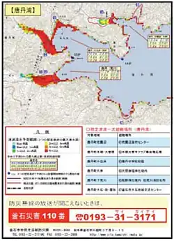 - Die Tsunamigefährdungskarte beruht mit ihren Tsunamiüberflutungsangaben auf drei Tsunami-Simulationen (1. historischer Meiji-Sanriku-Tsunami, 2. historischer Showa-Sanriku-Tsunami und 3. vorhergesagter Miyagi-Oki-Erdbeben-Tsunami). Die Karte des Kokudo Chiriin (国土地理院, Geographical Survey Institute=GSI) ist im Maßstab 1:25000 erstellt und für den Ausdruck im Papierformat A3 bestimmt. Die Studie zur Schadensprognose wurde von der Präfektur Iwate im Jahr 2003 und 2004 durchgeführt.