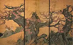 Das Wirken der genannten großen Meister fällt in die als Momoyama-Periode bezeichnete kunstgeschichtliche Epoche und die frühe Edo-Zeit und reichte von circa 1570 bis 1600. In dieser Zeit ließen die neuen Machthaber im Lande große Paläste bauen, deren Wände, innere Schiebetüren, aufwendig geschmückt und durch ebenso aufwändig gestaltete Stellschirme ergänzt wurden (Momoyama-Genremalerei). Der monochrome Malstil der frühen Kanō-Schule wurde zwar fortgeführt, nun aber kamen prächtige farbige Malereien, aufgetragen auf Goldgrund, dazu. Viele Gebäude existieren leider nicht mehr, so die der Burg Fushimi (伏見城) auf dem Momoyama („Pfirsichberg“) bei Uji[2], der der Kunstepoche den Namen gab, oder das Jurakudai (聚楽第), ein Palast in Kyōto, beide von Toyotomi Hideyoshi erbaut und nach dessen Tode zerstört. Von den erhaltenen Gebäuden ist am einfachsten zugänglich der Nijō-Palast in Kyōto, in dem Wandmalereien insbesondere von Tan’yū zu sehen sind. Der berühmte Stellschirm Eitokus[3] mit Zypresse (Nationalschatz) wird im National Museum Tōkyō aufbewahrt.