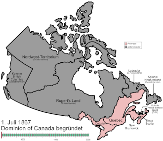 Während des Sezessionskriegs in den Vereinigten Staaten erkannten führende Politiker die Notwendigkeit, möglichen amerikanischen Expansionsbestrebungen einen starken Bundesstaat entgegenzustellen, und berieten in drei Verfassungskonferenzen über die Schaffung einer Kanadischen Konföderation. Daraus resultierte das Verfassungsgesetz von 1867, das am 1. Juli 1867 in Kraft trat und das Dominion Kanada schuf, das über eine gewisse Eigenständigkeit gegenüber der Kolonialmacht Großbritannien verfügte. Die Provinz Kanada wurde in Ontario und Québec aufgeteilt, hinzu kamen New Brunswick und Nova Scotia.