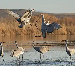 Zu den Überwinterungsorten des Großen Kanadakranichs und des Gewöhnlichen Kanadakranichs zählen Kalifornien, New Mexico, Mexiko und Texas. Der Platte River in Nebraska zählt zu den bekanntesten Zwischenstopps auf dem Zug in ihre Überwinterungsreviere. Dort versammeln sich im Frühjahr und im Herbst etwa 450.000 Kanadakraniche. In ihren Überwinterungsgebieten versammeln sich die Kranichscharen gewöhnlich zum Übernachten auf weiten Flachwasserflächen mit schlammigem oder sandigem Grund. Mit Anbruch des Tageslichts brechen sie von dort aus zur Nahrungssuche auf Feldern und Sumpfwiesen auf.[11]