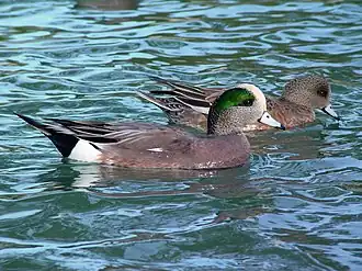 Kanadapfeifente (Mareca americana), vorne Erpel und dahinter das Weibchen | ||||||||||||