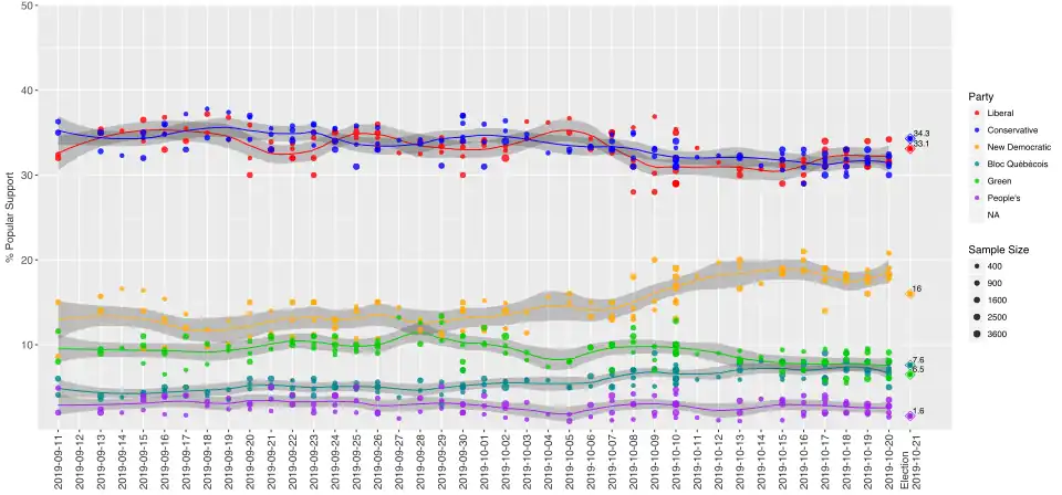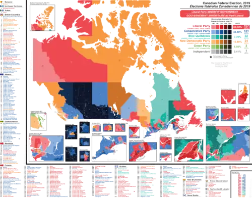 Die von Premierminister Justin Trudeau angeführte Liberale Partei blieb die stärkste Kraft, verlor aber die bisherige absolute Mehrheit und bildete dementsprechend eine Minderheitsregierung. Ihr Wähleranteil von 33,1 % ist der geringste einer Regierungspartei in der Geschichte Kanadas. Zwar konnte die Konservative Partei von Andrew Scheer mit 34,4 % einen etwas höheren Wähleranteil erringen, doch schlug sich dies aufgrund der hohen Wählerkonzentration in Alberta und Saskatchewan kaum in nennenswerten Sitzgewinnen nieder, da sie in den übrigen Landesteilen unterdurchschnittlich abschnitt.[1]
