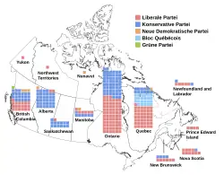 Die Wahlbeteiligung lag mit 68,66 % deutlich über der der vorangegangenen Wahl (62,25 %). Im Ergebnis zeigte sich ein Wahlsieg der Liberalen Partei. Die Partei hatte nach ihrem Tief in den Meinungsumfragen Anfang Januar 2025 einen spektakulären Wiederaufstieg geschafft und gewann bei der Wahl im Vergleich zu 2021 sowohl die relative Stimmenmehrheit als auch die relative Mandatsmehrheit sowie das beste Ergebnis seit 1968. Mit 169 gewonnenen Wahlkreisen (49,4 %) verfehlte sie knapp die absolute Mehrheit. Die Konservativen gewannen zwar ebenfalls deutlich an Stimmen und Mandaten hinzu, kamen damit aber nur auf den zweiten Platz. Der konservative Spitzenkandidat Pierre Poilievre verlor seinen seit 2004 gehaltenen Wahlkreis Carleton in Ontario an den liberalen Gegenkandidaten.[3] Hauptverlier der Wahl war die NDP, die fast zwei Drittel ihrer Wählerschaft verlor und von 24 auf 7 Unterhaussitze reduziert wurde. Dadurch verlor sie auch den Status als „offizielle Partei“, für den mindestens zwölf Unterhaussitze notwendig sind. Dies bedeutete für die Partei einen erheblichen Verlust an staatlicher Unterstützung. Die Grünen verloren einen der beiden von ihnen gehaltenen Wahlkreise und waren künftig nur noch mit ihrer Parteivorsitzenden Elizabeth May (Wahlkreis Saanich-Gulf Islands in British Columbia) im Unterhaus vertreten. Alle anderen Parteien und Einzelbewerber gingen leer aus.