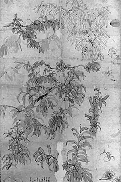 Kaneda Kazuo machte 1920 seinen Abschluss an der „Fachschule für Kunst und Kunstgewerbe Kyōto“ (京都市立美術工芸学校, Kyōto shiritsu bijutsu kōgei gakkō). Während seiner Ausbildung schloss er sich mit jungen Malern wie Tsuchida Bakusen, Ono Chikkyō, Sakakibara Shihō, Ono Chikkyō und anderen zur Gründung der Künstlervereinigung „Kokuga sōsaku kyōkai“ (国画創作協会) zusammen. Auf der 1. Ausstellung 1918 stellte er sein Bild „Pfirsiche“ (水蜜桃) aus, das dann den angesehenen Chogyū-Preis[A 1] erhielt. Auf der 2. Ausstellung der „Kokuga sōsaku kyōkai“ wurde allerdings sein bemalter Stellschirm „Weintrauben“ (葡萄図, Budō-zu) nicht angenommen.
