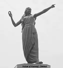 Kannagi (Tamil கண்ணகி), manchmal auch Kannaki,[1] ist eine legendäre Tamilin, die die Hauptfigur des Cilappatikaram-Epos aus dem 2. Jahrhundert ist.[2] Kannagi war Ehefrau von Kovalan. Obwohl sie von ihm betrogen wurde, blieb sie bei ihm und versuchte, wieder aufzubauen, was ihr Ehemann alles verloren hatte. Dieser wurde in einem ungerechten juristischen Verfahren durch den Pandya-König Nedunj Cheliyan I. mit dem Tod bestraft.[1] Kannagi verfluchte den König und seine Stadt Madurai. Der ungerechte König nahm sich das Leben und Madurai wurde durch ihren Fluch bis auf die Grundmauern niedergebrannt.[1] In der tamilischen Volkskunst wird Kannagi als Symbol – manchmal auch als Göttin – der Keuschheit verehrt. Skulpturen oder Reliefs in Hindu-Tempeln zeigen sie, wie sie ihr Fußkettchen zerreißt.[3][4]