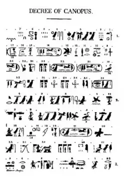 - ↑ Samuel Shaepe: The Decree of Canopus, in hieroglyphics and Greek: With Translations, and an Explanation of the Hieroglyphical Characters. J. Russel Smith, London 1870, Tafel 1 (Volltext als PDF).