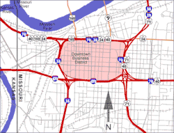Der Innenstadtbereich hat die Form eines Rechteckes, das an allen vier Seiten von Autobahnen begrenzt wird (Downtown Freeway Loop). Mehrere Brücken queren den im Norden der Stadt von West nach Ost verlaufenden Missouri, wobei die mit täglich über 100.000 Fahrzeugen am höchsten frequentierte Straßenbrücke die Christopher S. Bond Bridge nach North Kansas City ist. Die äußere Ringautobahn um die Metropolregion bildet die Interstate 435.