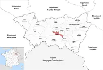 - ↑ Nur der südwestliche Teil der Gemeinde, der Rest gehört zum Kanton Épinal-2.