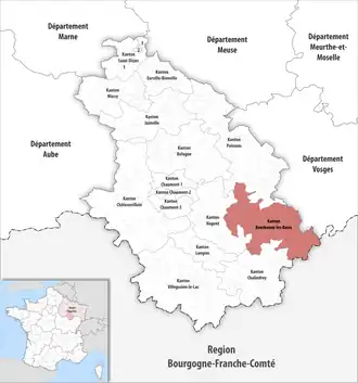 ![]() Lage des Kantons Bourbonne-les-Bains im Département Haute-Marne | |