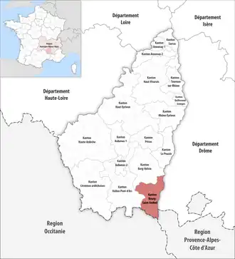![]() Lage des Kantons Bourg-Saint-Andéol im Département Ardèche | |