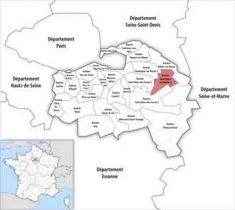 - ↑ Nur der östliche Teil der Gemeinde, der Rest gehört zum Kanton Champigny-sur-Marne-1.