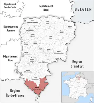 ![]() Lage des Kantons Essômes-sur-Marne im Département Aisne | |