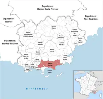 - ↑ Nur der nördliche Teil der Gemeinde, der Rest gehört zum Kanton Hyères.