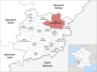![]() Lage des Kantons Le Haut Agenais Périgord im Département Lot-et-Garonne | |