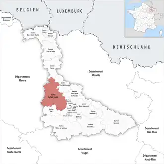 ![]() Lage des Kantons Le Nord-Toulois im Département Meurthe-et-Moselle | |