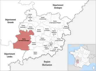 ![]() Lage des Kantons Les Forêts de Gascogne im Département Lot-et-Garonne | |