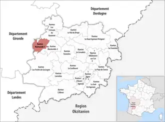 ![]() Lage des Kantons Marmande-1 im Département Lot-et-Garonne | |
