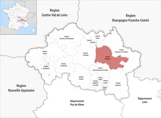 - ↑ Nur der südliche Teil der Gemeinde, der Rest gehört zum Kanton Moulins-1.