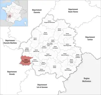 ![]() Lage des Kantons Pays de Montaigne et Gurson im Département Dordogne | |