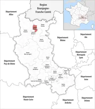- ↑ Nur der nördliche Teil der Gemeinde, der Rest gehört zum Kanton Roanne-2.