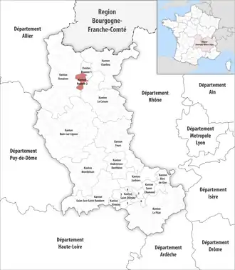 - ↑ Nur der südliche Teil der Gemeinde, der Rest gehört zum Kanton Roanne-1.