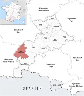 ![]() Lage des Kantons Saint-Gaudens im Département Haute-Garonne | |