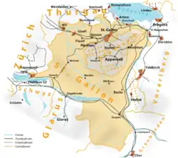 Bedeutendere Flüsse sind der Rhein, die Thur, die Linth, die Sitter und die Seez.