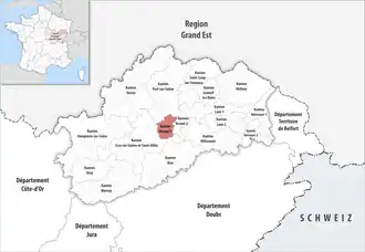 - ↑ Nur der westliche Teil der Gemeinde, der Rest gehört zum Kanton Vesoul-2.