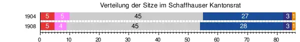 Seit der gleichzeitigen Gründung der FDP und der SP im Jahr 1904 lassen sich die Kantonsräte aus den Städten Schaffhausen und Neuhausen einer Partei zuordnen, während in den ländlicheren Gemeinden erst im Jahr 1918 durch die Gründung der Bauernpartei Schaffhausen (BP) die Parteipolitik Einzug hielt.[3]