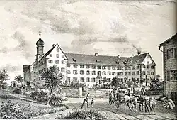Der heutige barocke Klosterkomplex stammt aus dem 18. Jahrhundert und wurde damals komplett neugebaut und 1716 fertiggestellt.[2] Der damalige Konvent war zu klein für eine gemeinnützige Aufgabe in dem neuerbauten vergrösserten Gebäude. Zudem traten nach der französischen Revolution ökonomische Schwierigkeiten auf. 1839–1840 errichtete der Kanton Thurgau aufgrund der rasanten medizinischen Entwicklung in Münsterlingen eine kombinierte Klinik für Kranke und Geisteskranke.[3] Das Kantonsspital Münsterlingen wurde von einer bildungsbürgerlichen Schicht gegründet und geleitet. Die Kantonalkrankenanstalt wurde am 15. Juni 1840 eröffnet, die sog. Irrenanstalt schon im Jahr 1839.[2] 1848 wurde im reformierten Kanton das katholische Kloster aufgelöst.[10]