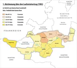 Am 11. September 1983 fanden sowohl im Bezirk Laufen als auch im Kanton Basel-Landschaft die entscheidenden Volksabstimmungen statt. Die Baselbieter mussten nicht nur über den Laufentalvertrag befinden, sondern auch über eine Änderung der Kantonsverfassung und ein Aufnahmegesetz. Die Verfassungsänderung erhöhte die Zahl der Landratsabgeordneten von 84 auf 90 und schuf je einen neuen Verwaltungs- und Gerichtsbezirk Laufen. Das Aufnahmegesetz regelte die Schaffung von Amtsvormundschafts- und Friedensrichterkreisen, die Übernahme des Spitals Laufen und die Weiterführung der progymnasialen Abteilung am Gymnasium Laufental-Thierstein.[47] Bei unterdurchschnittlicher Beteiligung sprachen sich die Baselbieter jeweils mit rund 73 % für die Annahme aus; nur drei Gemeinden lehnten ab.[54] Diese Ergebnisse waren letztlich völlig bedeutungslos, denn am selben Tag stimmte der Bezirk Laufen gegen den Kantonswechsel. Die Abstimmungsfrage «Wollt Ihr Euch aufgrund des vereinbarten Vertrags dem Kanton Basel-Landschaft anschliessen?» beantworteten 56,7 % der Abstimmenden mit Nein, die Beteiligung betrug 93,0 %. Ja-Mehrheiten resultierten nur in Blauen, Dittingen, Grellingen und Nenzlingen.[42]